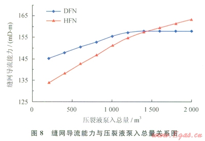 由圖8可知,隨著壓裂液泵入總量的增大,縫網(wǎng)導(dǎo)流能力增大;對于DFN模型,縫網(wǎng)導(dǎo)流能力從l45mD·m增大至l58mD·m,且當(dāng)壓裂液泵入總量超過l200m3后,縫網(wǎng)導(dǎo)流能力基本保持不變;對于HFN模型,縫網(wǎng)導(dǎo)流能力從l34mD·m增大至l63mD·m。當(dāng)壓裂液泵入總量低于l400m3時,DFN模型計算得到的縫網(wǎng)導(dǎo)流能力偏大;當(dāng)壓裂液泵入總量高于1400m3時,HFN模型計算值偏大。