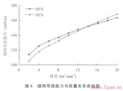 由圖6可知,隨著排量的增大,縫網(wǎng)導(dǎo)流能力增大;對于DFN模型,縫網(wǎng)導(dǎo)流能力從ll4mD·m增大至l63mD·m;對于HFN模型,縫網(wǎng)導(dǎo)流能力從106mD·m增大至169mD·m。當(dāng)流量低于l4m3/min時,DFN模型計算的縫網(wǎng)導(dǎo)流能力偏大;當(dāng)流量高于l4m3/min時,HFN模型計算值偏大。