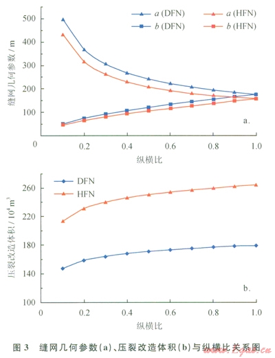 DFN模型和HFN模型計算所得縫網(wǎng)最大縫高分別為27.9m和27.2m,不隨縱橫比的變化而變化。在相同壓裂施工條件下,隨著縱橫比的增大,a逐漸降低,b逐漸增大,壓裂改造體積逐漸增大;對于DFN模型,a由500m降低至l76m,b由50m增大至l76m,壓裂改造體積由l47×104m3增大至179×l04m3;對于HFN模型,a由435m降低至158m,b由43.5m增大至158m,壓裂改造體積由214×104m3增大至264×104m3。在相同縱橫比下,利用DFN模型計算的縫網(wǎng)幾何參數(shù)比HFN計算值大(圖3-a);而利用DFN模型計算的壓裂改造體積比HFN模型計算值小(圖3-b)。