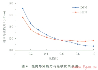 縫網(wǎng)導(dǎo)流能力為縫網(wǎng)平均縫寬與縫網(wǎng)平均滲透率之積,反映了流體在縫網(wǎng)中的流動能力。由圖4可知:隨著縱橫比的增大,縫網(wǎng)導(dǎo)流能力降低;對于DFN模型,縫網(wǎng)導(dǎo)流能力從18lmD·m降低至117mD·m;對于HFN模型,縫網(wǎng)導(dǎo)流能力從l67mD·m降低至126mD·m。當(dāng)縱橫比小于0.6時,DFN模型計算得到的縫網(wǎng)導(dǎo)流能力偏大;當(dāng)縱橫比大于0.6時,HFN模型計算值偏大。