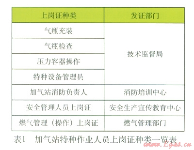 根據(jù)國(guó)家相關(guān)法律法規(guī)要求,加氣站特種作業(yè)人員還必須做到持證上崗,應(yīng)取得的上崗證及發(fā)證部門(mén)見(jiàn)表1。