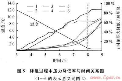考慮到介質內水合物在溫度下降過程中成核并生長,因此考察降溫過程中介質內壓力變化與時間的關系有助于進一步了解水合物在介質內的形成機理。計算溫度由12℃降至0.5℃過程中不同時刻氣體壓力降低量占總反應過程壓降百分比,并作圖5。