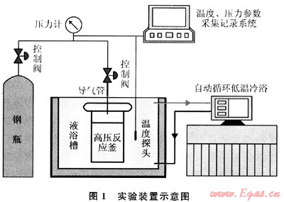 如圖1所示,實驗裝置由供氣、反應和數(shù)據(jù)采集3系統(tǒng)組成。供氣系統(tǒng)由儲氣鋼瓶組成,其內盛有純度99.99%的甲烷氣體;反應系統(tǒng)由液浴槽(內盛酒精冷卻液)、溫度探頭(-20~30℃±0.05℃)、高壓反應釜及自動循環(huán)低溫冷浴(自動控溫,-10~50℃±0.05℃)組成;數(shù)據(jù)采集系統(tǒng)采集整個實驗過程的溫度、壓力數(shù)據(jù),時間間隔1min。