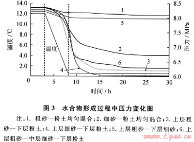 上述各組實驗內的水量均為100g,介質類型不同引起其內水合物最終生成形態(tài)差異明顯,說明介質內的水分分布狀態(tài)對水合物生成形態(tài)影響明顯。均勻混合介質中摻入粉土的粗砂、細砂顆粒較粗,等質量混合后對粉土持水作用影響不明顯,實驗中甲烷氣體從反應釜上部充入,介質上界面水分與氣體接觸充分,水合物形成于介質上界面,因而均勻混合介質內水合物最終生成相態(tài)基本類似(圖2中a、b)。層狀介質類型可明顯影響其內水合物生成形態(tài),原因可能是不同單一介質對水分產生的吸持力差別大(粉土>細砂>粗砂),介質搭配為層狀結構后,水分在層狀介質內的分布狀態(tài)及水分子在介質表面的吸附排列存在較大差異,因此層狀介質內水合物初級結構生成順序明顯不同,水合物最終生成形態(tài)也就存在較大差異。粗砂、細砂層狀介質內實驗前的水含量較高,介質持水能力較弱,水合物類似在過飽和介質內形成,形成較困難。另外,這些差異也反映出多孔介質內水合物形成機制非常復雜,此方面還需要做大量深入研究。