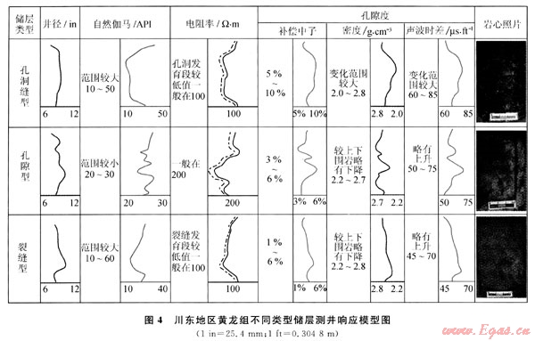 川東地區(qū)黃龍組碳酸鹽巖受到長(zhǎng)期的大氣水風(fēng)化、剝蝕和溶蝕作用改造,由孔隙、溶洞和裂縫組成的儲(chǔ)集空間很發(fā)育,但也非常復(fù)雜[4~5],按孔、洞、縫的組合方式及其所占比例的差異性可將儲(chǔ)層劃分為不同孔、滲特征的3種類型,各類型儲(chǔ)層的常規(guī)測(cè)井響應(yīng)特征有明顯差異[6~8],具有不同的測(cè)井響應(yīng)模型。