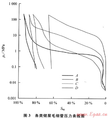 Ⅳ型:孔隙類型為粒內(nèi)溶孔以及裂縫組合,巖石類型主要為晶粒灰?guī)r、白云質(zhì)灰?guī)r和泥微晶灰?guī)r,毛細(xì)管壓力曲線為單峰細(xì)歪度,也呈明顯向左微凹的平臺(tái)狀(圖3中D曲線)。排驅(qū)壓力大于5.0MPa,中值壓力大于10.0MPa,孔隙度小于3%,滲透率小于0.01mD,為該區(qū)極差或無(wú)儲(chǔ)集能力的孔隙結(jié)構(gòu)類型。