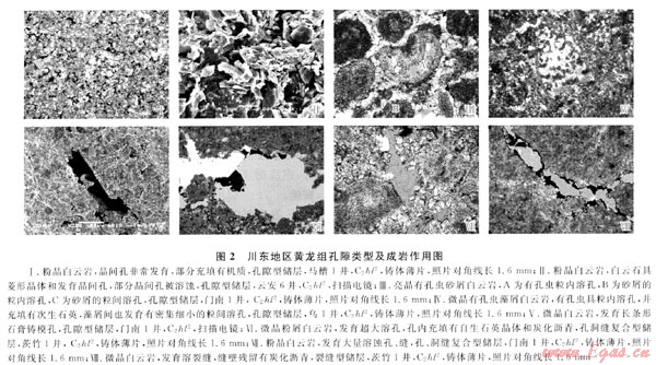 不同沉積微相和巖石類型的樣品物性分析資料,表明川東黃龍組碳酸鹽巖儲(chǔ)層中以粒屑灘相的顆粒白云巖、晶粒白云巖及白云質(zhì)巖溶角礫巖的物性為最好,以發(fā)育孔洞縫型和孔隙型儲(chǔ)層為主,而薩勃哈相的次生晶?;?guī)r、泥-微晶白云巖和開(kāi)闊-局限海灣潮下相的泥-微晶灰?guī)r及膠結(jié)作用較強(qiáng)的巖溶角礫巖普遍很致密,僅局部發(fā)育有裂縫型儲(chǔ)層。