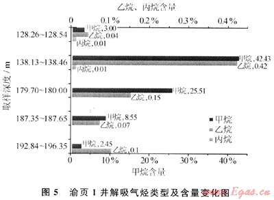 渝頁1井提撈的黑色巖心均為不含地層水的“干層”,即不含地層水(包括束縛水)的含氣層,若將隨機選取的巖心置于水中,則均將發(fā)生針尖狀氣泡不斷溢出的現(xiàn)象,視為頁巖氣的最直接證據(jù);此外,在鉆進過程中,還多次在井筒中發(fā)現(xiàn)了氣泡溢出以及井口空氣中甲烷含量異常等現(xiàn)象,證實了頁巖中天然氣的直接存在。同時,渝頁1井的16塊樣品現(xiàn)場解析表明,位于281.Om和287.5m井深處樣品的含氣量現(xiàn)場解析值最高,計算現(xiàn)場解析氣量達到并超過0.1m3/t(解析持續(xù)時間為6h)??紤]到井筒提心時間較長(4.2h)、損失氣量及殘留氣量較多等原因,再結(jié)合已有解析曲線的比較研究,推測頁巖吸附含氣量大于1.0m3/t。結(jié)合頁巖總含氣量分析原理,初步計算頁巖總含氣量(吸附氣+游離氣)介于1.0~3.Om3/t之間,視為具有工業(yè)價值的頁巖氣。進一步的色譜分析結(jié)果表明,天然氣樣品中同時含有甲烷和乙烷,在128.23~138.46m和206.75~209.18m井深等樣品中還發(fā)現(xiàn)了丙烷的存在(圖5)。其中,138.13~138.46m井深樣品中的甲烷、乙烷和丙烷含量分別為42.43%、0.42%、0.01%,其余為N2、CO2和O2等大氣成分。解吸樣品中烴類氣體含量的百分比并不高,可能主要反映為解析儀中空氣樣品的殘留或地下風(fēng)化帶中少量空氣成分的進入。