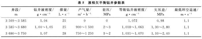 2) 提高了機械鉆速,延長鉆頭壽命。欠平衡鉆進過程中,鉆井液循環(huán)壓力低于地層壓力,消除了正壓差對巖屑的壓持效應,避免了巖石的重復研磨,提高了機械鉆速,延長了鉆頭壽命。欠平衡井段3569.2~3750.0m,進尺180.80m,純鉆進86.67h,平均機械鉆速2.09m/h,使用萬216mm牙輪鉆頭一只,鉆時超過6m/h的段長就有31m。