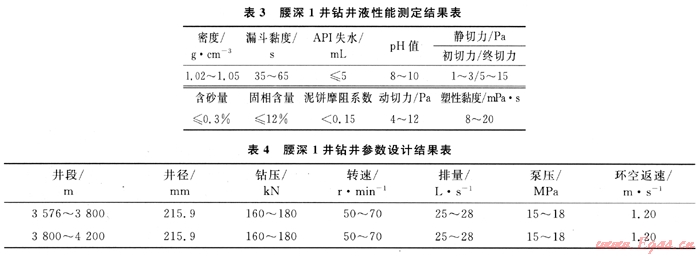 從腰深1井鄰井DB2井和DB11井情況來看:①DB2井在鉆進至嫩江組、姚家組地層時,出現(xiàn)垮塌掉塊現(xiàn)象;②DB11井鉆進至4002.07m時出現(xiàn)井內垮塌現(xiàn)象,經調整鉆井液性能后返出大量巖屑,井下才恢復正常。從腰深1井地層巖性預測結果可知,欠平衡鉆井井段存在泥巖層,易吸水膨脹而產生剝落掉塊、垮塌。從鄰井分析和腰深1井巖性預測均表明,在欠平衡井段應選用防塌性能好的鉆井液體系,為此決定采用聚合醇抑制型防塌鉆井液體系。