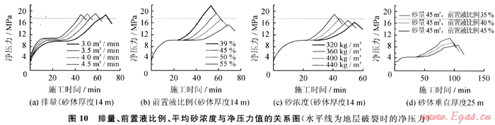 從圖10可以得出排量和平均砂濃度沒(méi)有前置液比例對(duì)縫內(nèi)凈壓力上漲的控制力度大,且25m垂直厚度的厚儲(chǔ)層凈壓力漲幅遠(yuǎn)低于14m的薄儲(chǔ)層凈壓力的漲幅。按照凈壓力預(yù)測(cè)結(jié)果,以增加主裂縫縫長(zhǎng)和控制次生裂縫產(chǎn)生為出發(fā)點(diǎn),蘇5、桃7區(qū)塊水平井分段壓裂參數(shù)優(yōu)化范圍如下:排量3.5~4.0m3/min、薄砂體前置液比例45%~50%,厚砂體前置液比例43%~45%,平均砂濃度360~400kg/m3。