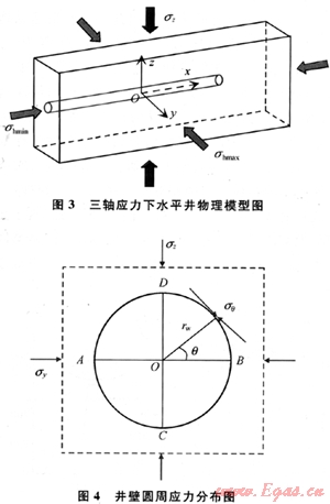 無(wú)限大地層水平鉆進(jìn)后在井壁周圍會(huì)產(chǎn)生應(yīng)力集中[2~3],其物理模型如圖3所示,并假設(shè)井筒方向與水平最小主應(yīng)力方向平行。