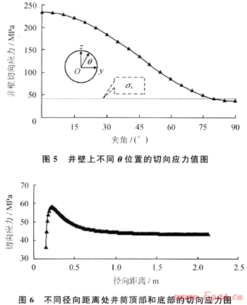 井壁圓周應(yīng)力分布如圖4所示,其中徑向應(yīng)力和切向應(yīng)力由式(1)、(2)和式(3)計(jì)算,垂向應(yīng)力由(4)式計(jì)算。