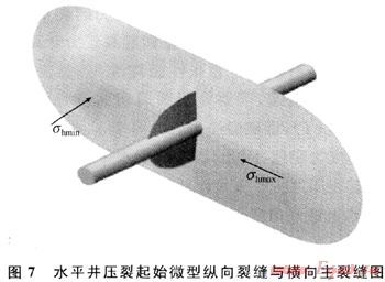 2) 裸眼水平井由于應(yīng)力集中使得縱向裂縫的破裂壓力比橫向裂縫的破裂壓力低,壓裂首先形成縱向微裂縫,在穿過(guò)應(yīng)力集中帶之后形成橫向主裂縫。