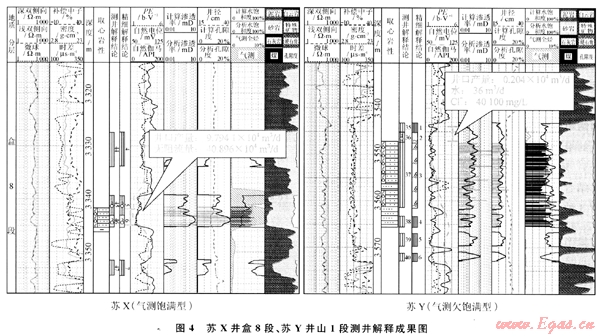 蘇X井盒8段(圖4),峰形飽滿,全烴顯示厚度比儲層厚度大,氣測解釋為氣層,電測解釋氣層,綜合分析解釋為氣層,試氣獲無阻流量9.7914×104m3/d的工業(yè)氣流。蘇Y井山1段(圖4),全烴峰值顯示較低,峰形不飽滿,全烴顯示厚度小于儲層厚度,氣測解釋為氣水同層,電測解釋為差氣層,綜合分析為氣水同層。經(jīng)測試井口產(chǎn)量0.035 4×104m3/d,水36m3/d,驗證了利用聲波時差 電阻率圖版法與氣測綜合分析判斷識別氣水層的準確性。