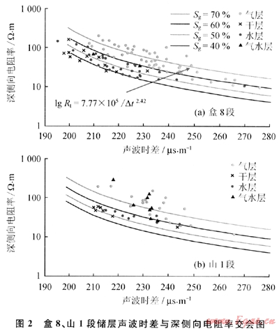 以蘇里格西部地區(qū)的完試資料基礎(chǔ)做分層位聲段聲波時差-深側(cè)向電阻率-含氣飽和度交會圖(盒8、山1段儲層及地層水礦化度不同),利用該圖版(圖2)可以看到:首先氣水層的電阻率沒有固定的界線值,隨著聲波時差的增大,氣層的電阻率降低;同時,根據(jù)含水飽和度情況,可以在一定的波動范圍內(nèi)酌情調(diào)整巖電參數(shù),使含水飽和度模型趨于合理化,氣水識別精度有了相應(yīng)的提高。