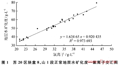 蘇20區(qū)塊盒8、山1段的地層水中氯離子含量在20320~49060mg/L,占陰離子總量的98%以上。地層水礦化度與Cl-含量交會圖(圖1)中的交會線對應(yīng)性很好,表明地層水中的Cl-嚴格控制總離子量,氯離子和礦化度幾乎同步等速變化。