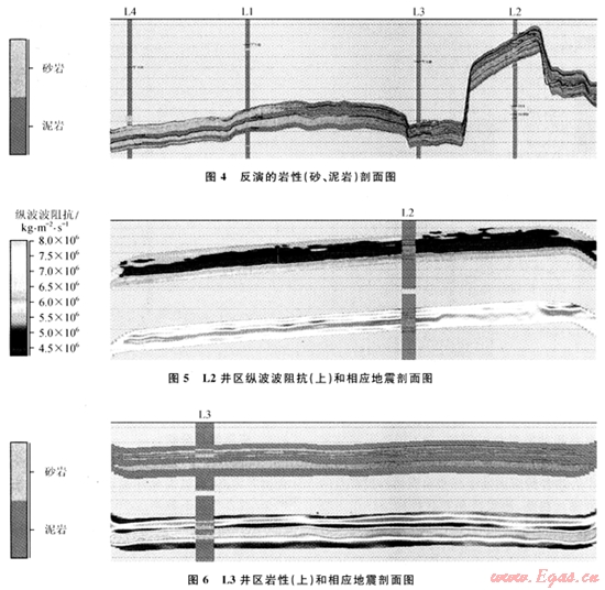 對(duì)比圖1~4,可以看出疊前隨機(jī)反演結(jié)果的垂直分辨率較疊前AVA同步反演結(jié)果有很大提高,地震資料無(wú)法分辨的L2井區(qū)的兩套薄砂層(圖5)和L3井區(qū)的砂泥互層(圖6)在反演結(jié)果中均表現(xiàn)十分清楚。該氣組儲(chǔ)層是低水位期在內(nèi)陸架環(huán)境中形成的近源風(fēng)暴席狀沙沉積,分布較穩(wěn)定。而反演結(jié)果中儲(chǔ)層橫向連續(xù)性也很好,符合該區(qū)的沉積相分布特征;同時(shí)上下層位的接觸關(guān)系與原始地震資料也吻合很好,進(jìn)一步驗(yàn)證了預(yù)測(cè)的可靠性。反演成果在該氣田的開發(fā)井設(shè)計(jì)優(yōu)化中得到了實(shí)際應(yīng)用,并為今后的氣田開發(fā)實(shí)施提供了有力的資料,有利于降低開發(fā)風(fēng)險(xiǎn)、提高效率。