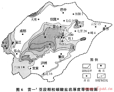綜上所述,上述2套儲(chǔ)層的發(fā)育條件和區(qū)域分布不同,風(fēng)化殼型巖溶儲(chǔ)層受微相和巖溶作用的控制,縱向上分布在風(fēng)化殼下數(shù)十米范圍內(nèi),平面上分布于有利巖相和有利巖溶古地貌單元疊合部位,初步預(yù)測LG-營山-西充-遂寧是勘探有利區(qū),勘探面積約2×104km2;顆粒白云巖儲(chǔ)層主要受微相控制,雷一顆粒灘分布于川中磨溪-廣安地區(qū),面積約1×104km2;雷三顆粒灘分布于龍門山前帶,面積約8000km2。