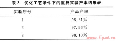 為了驗證正交實驗優(yōu)化出來的工藝條件的可靠性,在該條件下又進(jìn)行了3次重復(fù)實驗,得到的產(chǎn)率結(jié)果如表3所示。