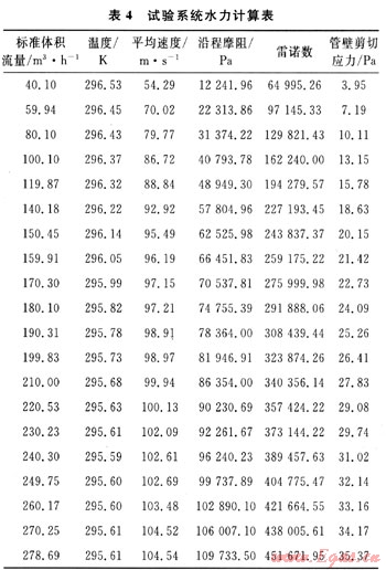 在進(jìn)行減阻劑測試之前,首先要進(jìn)行空白管道的水力分析。空氣由壓縮機(jī)壓縮到0.8MPa后進(jìn)入測試管道,保證壓縮機(jī)出口壓力pi不變,標(biāo)準(zhǔn)體積流量Qg調(diào)節(jié)范圍為40~280m3/h,經(jīng)測量、計算得到一組數(shù)據(jù)如表4所示。