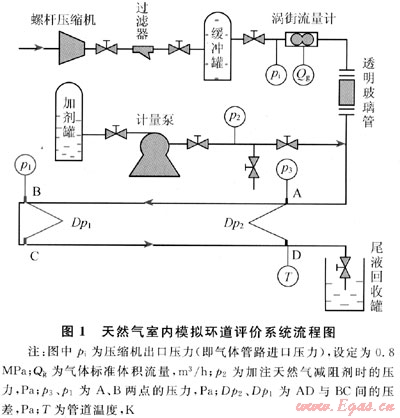 根據(jù)對天然氣管輸減阻劑性質(zhì)及作用機(jī)理的研究,設(shè)計了天然氣室內(nèi)模擬環(huán)道評價系統(tǒng),如圖1所示。
