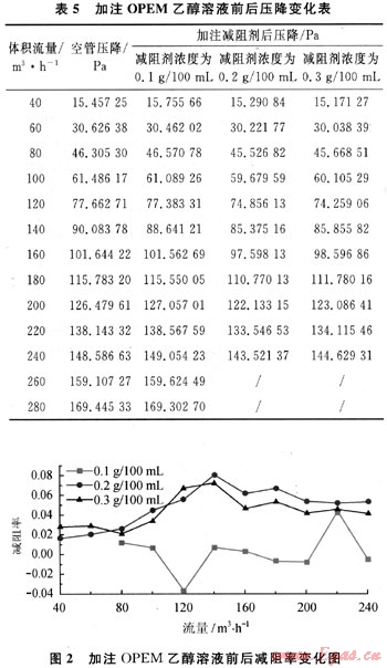 配制了3種濃度的十八醇磷酸酯單乙醇銨鹽(OPEM)乙醇溶液,依次將其注入管道中,浸泡4h后考察不同濃度、不同雷諾數(shù)下的減阻效果。結(jié)果如表5與圖2所示。