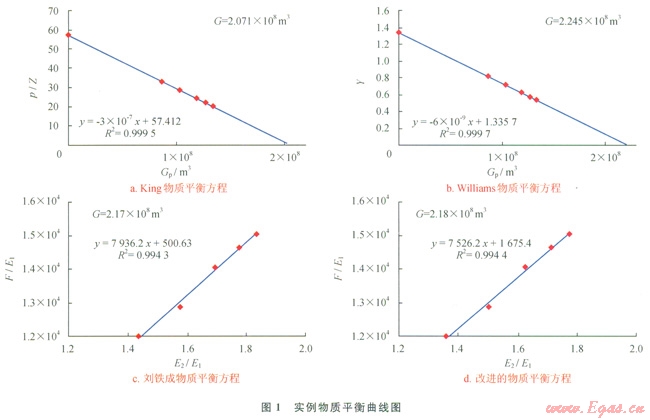 根據(jù)上述數(shù)據(jù),利用King物質(zhì)平衡方程、williams物質(zhì)平衡方程、劉鐵成物質(zhì)平衡方程及筆者提出的改進的物質(zhì)平衡方程,計算了該實例頁巖氣井的原始地質(zhì)儲量(1)。