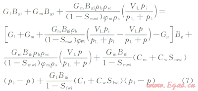 Gt為頁巖氣總地質(zhì)儲量,m3;Gm為摹質(zhì)系統(tǒng)游離氣儲量,m3;Gf為裂縫系統(tǒng)游離氣儲量,m3Gasc為解吸氣地面標準體積,m3;Gas為地下吸附相體積,m3j為孔隙度,無量綱;Smwi為基質(zhì)系統(tǒng)束縛水飽和度,無量綱;Sfwi為裂縫系統(tǒng)束縛水飽和度,無量綱;Bgi為地層壓力為p時氣體體積系數(shù),無量綱;Bg為地層壓力為p時氣體體積系數(shù),無量綱;rb為巖石視密度,gcm3rs為地層條件下吸附相密度,gcm3;rsc為標準狀態(tài)下天然氣密度,gcm3V為在一定溫度和壓力下單位質(zhì)量巖石所吸附的標準狀態(tài)氣體體積,m3t;VLLangmuir體積,在測量溫度和最大壓力下的理論最大吸附體積值,m3t;pLLangmuir壓力,理論最大吸附體積一半的氣體被吸附至表面時的壓力,MPa;pi為原始地層壓力,MPa;p為地層壓力,MPa;GP為累計產(chǎn)氣量,m3;Gh為目前天然氣地質(zhì)儲量,m3;Cw為地層水壓縮系數(shù),MPa-1;Cf為裂縫壓縮系數(shù),MPa-1Cm為基質(zhì)壓縮系數(shù),MPa-1;T為儲層溫度,K;gg為氣體相對密度,無量綱。