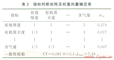 根據(jù)前述選取的指標(biāo)體系,通過調(diào)查專家意見,并參考專家以前在頁巖氣選區(qū)時賦予指標(biāo)不同的權(quán)重值,計算了各個指標(biāo)的權(quán)重。建立指標(biāo)兩兩判斷矩陣,計算最大特征值并檢驗判斷矩陣的一致性(表2)。驗證結(jié)果表明:矩陣具有滿意的一致性,層次分析法得到的指標(biāo)權(quán)重為:waj=(0.174,0.077,0.105,0.313,0.206,0.079,0.047).