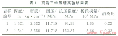 通過巖石力學(xué)實驗,龍馬溪組二段頁巖儲層基質(zhì)巖石,抗壓強度分布在91~152MPa,平均抗壓強度為121.98MPa,平均楊氏模量為2.15×104MPa,平均泊松比為0.23(表1)。測試數(shù)據(jù)分析結(jié)果可知,巖樣2對比巖樣l具有低泊松比和高楊氏模量的特征,說明龍馬溪組二段在深度1541m時,頁巖脆性程度最優(yōu),與先前的礦物分析和脆性指數(shù)得到的結(jié)論相符。