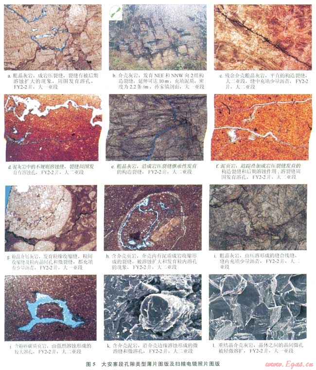 該區(qū)大安寨段由溶蝕形成的溶孔也較為發(fā)育,為次重要儲(chǔ)集空間類(lèi)型,主要發(fā)育在各類(lèi)石灰?guī)r中。溶孔和溶洞是在早期孔隙和裂縫的基礎(chǔ)上,在埋藏成巖過(guò)程中經(jīng)深部熱液溶蝕擴(kuò)大而成[18-19],孔徑介于0.0l~2mm的為溶孔(圖5-j),大于2mm為的溶洞,個(gè)別可超過(guò)10mm,環(huán)邊生長(zhǎng)有方解石晶簇的為晶洞。溶孔、溶洞和晶洞數(shù)量很少,但在各層段均有分布,分布在裂縫較發(fā)育的介殼灰?guī)r和含介殼泥頁(yè)巖中(圖5-a、d、f、h),常伴生豐富的粒緣微溶縫和微溶孔(圖5-k)。