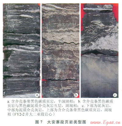 大安寨段頁(yè)巖類(lèi)型豐富,而具備成藏條件的頁(yè)巖主體為半深湖—湖坡相的薄層狀暗色碳質(zhì)頁(yè)巖,頁(yè)巖中往往含介殼條帶或夾有薄層狀黑色碳泥質(zhì)介殼灰?guī)r(圖7),而淺湖、濱湖相的灰色和雜色頁(yè)巖、粉砂質(zhì)頁(yè)巖、鈣質(zhì)頁(yè)巖等不具備頁(yè)巖氣成藏條件。碳質(zhì)頁(yè)巖厚度對(duì)頁(yè)巖氣的勘探開(kāi)發(fā)具有重要意義,特點(diǎn)為:①大一亞段碳質(zhì)頁(yè)巖主要出現(xiàn)在下部,為與薄層碳泥質(zhì)介殼灰?guī)r互層組合,碳質(zhì)頁(yè)巖的累計(jì)厚度為8~12m;②大二亞段由大套碳質(zhì)頁(yè)巖夾泥質(zhì)介殼灰?guī)r條帶或薄層組成,單層頁(yè)巖的厚度一般不超過(guò)2m,累計(jì)厚度為30~50m;③大三亞段碳質(zhì)頁(yè)巖出現(xiàn)在上部,也為與薄層碳泥質(zhì)介殼灰?guī)r互層組合,碳質(zhì)頁(yè)巖的累計(jì)厚度很小,僅為2~5m。需指出的是,大安寨段碳質(zhì)頁(yè)巖的發(fā)育不僅具有從大三亞段上部經(jīng)大二亞段至大一亞段下部的連續(xù)沉積特點(diǎn)(圖2),而且40~60m的總累計(jì)厚度在湖坡和半深湖亞相區(qū)(圖3、4)范圍內(nèi)的分布非常穩(wěn)定,對(duì)照美國(guó)密執(zhí)安盆地Antrim頁(yè)巖氣藏最小頁(yè)巖厚度僅為9.1m,特沃斯盆地Barnett頁(yè)巖氣藏30.5m的頁(yè)巖厚度已被證明具有商業(yè)開(kāi)采價(jià)值的現(xiàn)狀[21],該區(qū)大安寨碳質(zhì)頁(yè)巖的厚度已完全具備形成頁(yè)巖氣藏的條件。