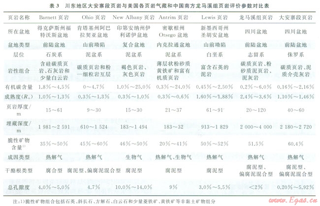 鑒于目前國(guó)內(nèi)外還沒(méi)有形成頁(yè)巖氣(油)藏的評(píng)價(jià)標(biāo)準(zhǔn),筆者以美國(guó)Barnett頁(yè)巖和Ohio頁(yè)巖氣藏勘探經(jīng)驗(yàn)為指導(dǎo)[28],結(jié)合川東地區(qū)大安寨段頁(yè)巖TOC較高、類(lèi)型較好,演化程度適中、累計(jì)厚度較大、分布范圍廣而穩(wěn)定、埋藏深度適中、脆性礦物含量高和具有較好—好的烴源巖性質(zhì)等特征,與美國(guó)眾多頁(yè)巖氣盆地和中國(guó)南方頁(yè)巖氣勘探近期取得突破性進(jìn)展的志留系龍馬溪組頁(yè)巖[26]各項(xiàng)參數(shù)進(jìn)行對(duì)比(表3),同時(shí)考慮川東地區(qū)大安寨段頁(yè)巖分布而積都超過(guò)2000km2,地質(zhì)歷史中始終深埋地腹而未被剝蝕,地表?xiàng)l件以地形高差相對(duì)較小丘陵和中山為主,大、小江河密集分布,水資源豐富及交通便利等相關(guān)的輔要條件,對(duì)川東地區(qū)大安寨段頁(yè)巖氣(油)成藏條件和資源潛力進(jìn)行綜合評(píng)價(jià)。結(jié)果認(rèn)為:該地區(qū)大安寨段頁(yè)巖具備非常優(yōu)越的頁(yè)巖氣(油)成藏條件。