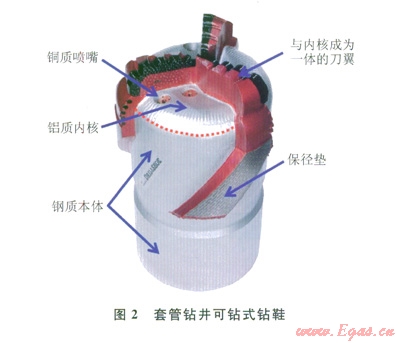 水眼上可以安裝由銅或陶瓷材料制成的、具有可鉆性的噴嘴,噴嘴的直徑從7.9375mm到25.4mm,可供選擇。由于內核、刀翼以及噴嘴都是由可鉆性好的材料制成,因此鉆鞋可以被常用的牙輪鉆頭或PDC鉆頭從內部鉆穿。