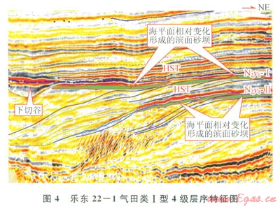 樂東22-1氣田主物源來自北東方向的海南島,為發(fā)育在陸架濱 淺海背景下,受沉積坡折控制的灘壩復(fù)合體沉積。儲(chǔ)層的形成,與海平面短期快速升降、強(qiáng)制性海退背景下形成的4級(jí)層序有關(guān)。4級(jí)層序界面以類工型界面為主,層序結(jié)構(gòu)主要表現(xiàn)為前積型特征,頂積層較薄(圖4)。S型疊加4級(jí)層序的頂積層可形成良好的儲(chǔ)集層,在沉積坡折以下多以淺海相泥巖、泥質(zhì)粉砂巖為主,儲(chǔ)層不發(fā)育(圖5)。準(zhǔn)確把握層序形成機(jī)制和疊加樣式[7-8],可以有效地預(yù)測和把握有利儲(chǔ)層的分布,減少儲(chǔ)層預(yù)測上的失誤,降低風(fēng)險(xiǎn)。通過對(duì)儲(chǔ)層的精細(xì)描述,刻畫有利砂體的展布,指導(dǎo)生產(chǎn)井的部署和井位優(yōu)化。