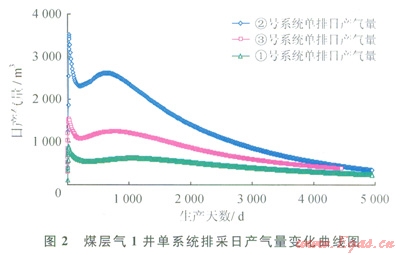 單獨排采①號系統(tǒng),產(chǎn)氣量介于306~905m3/d,平均為431m3/d(圖2),15a排采的累計產(chǎn)氣量為2.13×106m3(表2);單獨排采②號系統(tǒng),產(chǎn)氣量介于502~2952m3/d,平均為lll7m3/d,15a排采的累計產(chǎn)氣量為5.53×106m3;單獨排采③號系統(tǒng),產(chǎn)氣量介于413~l486m3/d,平均為721m3/d。15a排采的累計產(chǎn)氣量為3.57×106m3。