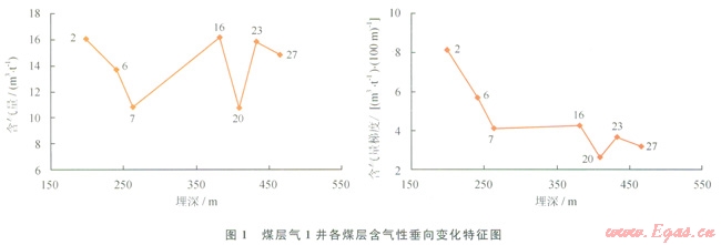處于織納煤田比德三塘礦區(qū)的煤層氣l井,其各可采煤層(2、6、7、16、20、23、27號煤層)實測含氣量與含氣梯度隨層位降低均呈波動式變化(表1,圖l)。