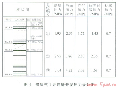 由于各含氣系統(tǒng)壓力不同,合層排采會產(chǎn)生層間干擾。煤層氣l井鉆井、固井結(jié)束后,由靜止液而高度計算得出①、②、③號含氣系統(tǒng)的液而壓力分別為2.55、3.86、4.22MPa(圖4),分別比各系統(tǒng)的儲層壓力高0.6、0.91、1.18MPa,若井孔處理不干凈的話,對煤儲層有一定程度的污染?;趯崪y含氣量、蘭格繆爾參數(shù)計算①、②、③號含氣系統(tǒng)的臨界解吸壓力分別為1.43、2.36、1.68MPa,產(chǎn)氣壓力分別為l.72、2.83、2.02MPa(基于山西沁水盆地南部煤層氣井排采實踐,產(chǎn)氣壓力約為臨界解吸壓力的1.2倍[16-19]。依據(jù)煤層氣l井各系統(tǒng)內(nèi)煤儲層壓力、臨界解吸壓力和產(chǎn)氣壓力,對3個含氣系統(tǒng)設(shè)計了遞進開發(fā)次序。