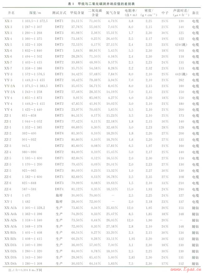 烴類氣與二氧化碳?xì)鈱釉跍y(cè)井曲線上的響應(yīng)特征與油、水層有較明顯的區(qū)別,而它們兩者之間的差異卻較小,這是造成用測(cè)井資料區(qū)分甲烷和二氧化碳困難的根本原因。但通過(guò)對(duì)二者理論上測(cè)井響應(yīng)值的研究可知,兩者還是存在一定的差別,因而兩種氣體在測(cè)井曲線上必定存在或多或少的差異,這是用測(cè)井資料定性、定量區(qū)分烴類氣與二氧化碳?xì)獾幕A(chǔ)[4]。