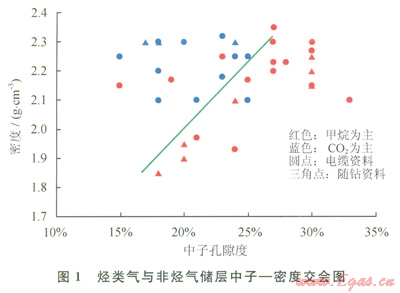 根據(jù)上述分析,采用交會(huì)圖技術(shù)研究了兩者在測(cè)井響應(yīng)上的差別。在樂(lè)東l5-1/22-1研究區(qū)選取了經(jīng)測(cè)試、電纜測(cè)試取樣或試生產(chǎn)證實(shí)含量相對(duì)比較高的甲烷或二氧化碳層段(表1),并定義甲烷含量高于50%的氣層為以甲烷為主的氣層,否則為以非烴為主(CO2為主)的氣層,然后利用這些層段的測(cè)井資料分別作出了密度一中子、密度一聲波交會(huì)圖(圖1、2)。從圖l、2中可以看出:烴類氣與二氧化碳?xì)怏w在測(cè)井響應(yīng)值上是存在一定差別的,從而可以通過(guò)這種差異來(lái)區(qū)分烴類氣與二氧化碳?xì)鈱?sup>[10]。