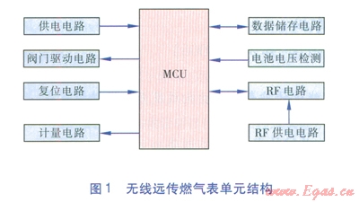 無線遠(yuǎn)傳燃?xì)獗碛杀砭摺?span lang="EN-US">MCU(Micro Controller Unit,微控制單元)、通信模塊(RF電路)、計(jì)數(shù)采樣裝置、控制機(jī)構(gòu)等單元組成。其中,MCU采用l6位單片機(jī),該單片機(jī)具有功耗低、運(yùn)算速度快、可在線編程等優(yōu)點(diǎn)。通信模塊采用3種工作頻率(433、868、915MHz,分別為中國、歐洲國家、美國采用的工作頻率)的RF電路,采用GFSK(Gauss Frequency Shift Keying,高斯頻移鍵控)調(diào)制模式,具有極好的頻率穩(wěn)定性和較高的接收靈敏度,符合國家無線電管理委員會(huì)的相關(guān)規(guī)定。無線遠(yuǎn)傳燃?xì)獗韱卧Y(jié)構(gòu)見圖l。