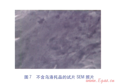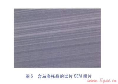 當旋轉(zhuǎn)掛片腐蝕實驗結(jié)束后,從溶液中取出金屬碳鋼掛片,對試片分別清洗后粘在貼有雙面膠的試樣臺上。為了保證試片表面各處都能夠均勻?qū)щ?,避免因電荷積累造成尖端放電而影響成像質(zhì)量,測試前要對試片進行噴金(Au)處理。噴金后置于KYKY28008型掃描電子顯微鏡下觀察,加速電壓為15kV,放大倍數(shù)為5000。觀察結(jié)果表明,含緩蝕劑烏洛托品的5%羥基亞乙基二膦酸清洗劑中,碳鋼試片的腐蝕痕跡不明顯,顯示出較完整的基材表面,見圖6;不含緩蝕劑的清洗劑中金屬碳鋼試片表面出現(xiàn)了一定的坑狀腐蝕,試片表面稍微粗糙,見圖7。
