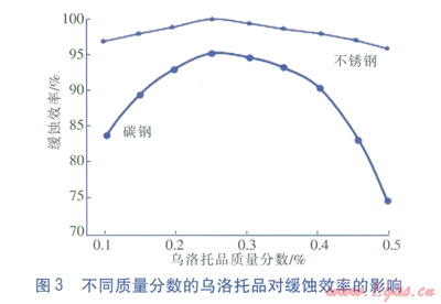 在質(zhì)量分數(shù)為5%的羥基亞乙基二膦酸清洗溶液中,分別加入不同質(zhì)量分數(shù)的烏洛托品緩蝕劑,然后按照3.3.1方法分別測定不銹鋼及碳鋼標準試片的腐蝕速率,由此計算出烏洛托品緩蝕劑對金屬不銹鋼及碳鋼的緩蝕效率,實驗結(jié)果見圖3。