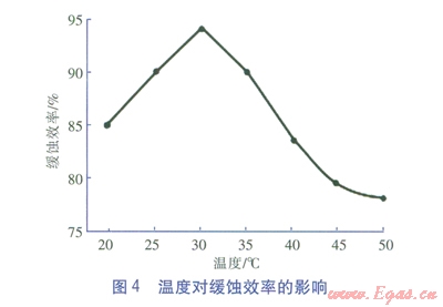 由圖4可以看出,烏洛托品對碳鋼的緩蝕效率先是隨溫度的升高而增大,達到極大值94.6%后開始下降,因此在25~35℃溫度范圍內(nèi)進行清洗可以達到較好的緩蝕效果。