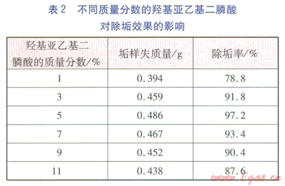 實驗方法采用失重法,具體方法步驟如下:用孔徑8mm的篩子篩選顆粒均勻的大理石(CaCO3)作為垢樣,使用BT224S型電子分析天平準確稱量0.5g垢樣數(shù)組,分別放入盛有100mL不同羥基亞乙基二膦酸質(zhì)量分數(shù)的清洗液的試管中,在溫度為30℃的501BS型恒溫水浴鍋中靜置10h后,用布氏漏斗進行真空抽濾,將殘余的垢樣放入768-3型遠紅外干燥箱中在50℃下烘干至恒重,最后放入玻璃下燥器中冷卻至室溫后于BT224S型電子分析天平上再次稱重。根據(jù)公式(3)計算清洗劑的除垢率并將實驗結(jié)果列于表2。