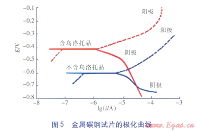 由圖5可以看出:在其他條件相同的情況下,碳鋼試片在含烏洛托品緩蝕劑的清洗液中與不含烏洛托品緩蝕劑的清洗液中相比,腐蝕電位明顯正移,說明在含烏洛托品緩蝕劑的清洗液中的試片更不易腐蝕,烏洛托品是一種能夠抑制陽極極化的緩蝕劑,在清洗過程中可以防止金屬的腐蝕。