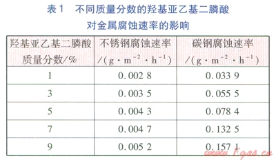 由表l可見,隨著羥基亞乙基二膦酸的質(zhì)量分數(shù)逐漸增加,不銹鋼的腐蝕速率增大的幅度比較平緩,說明影響不太明顯;對碳鋼的腐蝕速率影響比較大,特別是當羥基亞乙基二膦酸的質(zhì)量分數(shù)超過5%以后,碳鋼的腐蝕速率增長幅度非常明顯,當質(zhì)量分數(shù)達到9%時與5%時相比增長近一倍。因此,實際清洗時把清洗主劑羥基亞乙基二膦酸的質(zhì)量分數(shù)控制在5%較為合適。