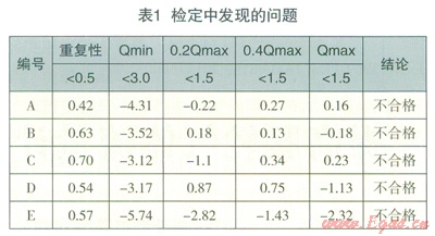 一批準(zhǔn)確度等級(jí)為l.5級(jí)的腰輪流量計(jì)經(jīng)維修組裝完成后,沒(méi)有通過(guò)模擬運(yùn)行工作臺(tái)跑活,送往檢測(cè)中心進(jìn)行檢定,檢定結(jié)果顯示,其中5臺(tái)表具的重復(fù)性和點(diǎn)誤差數(shù)據(jù)不合格(表1)。