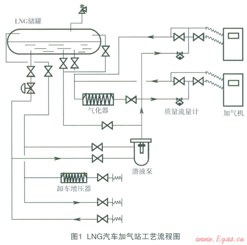 LNC汽車加氣站具有卸車、儲(chǔ)存、增壓、加氣等工藝過程,南此形成了相應(yīng)的T藝流程,見圖l。